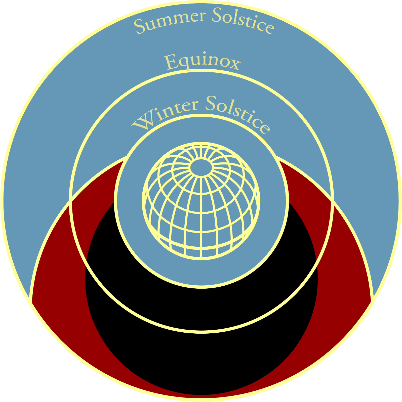 If we let the surface of the map run right through the equator of the globe, our equatorial circle is the same size as the globe itself. The winter solstice line sits inside of this, and the summer solstice line sits outside. This gives us the basic form of the clock face.