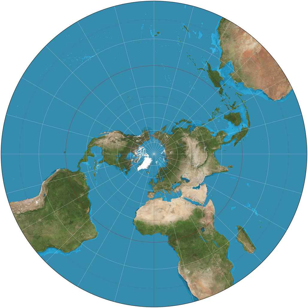 Enough for now about Mercator and Mollweide. A conformal projection is appropriate for our astrolabe because astronomical measurements are all about angles, not area. Among conformal projections, the stereographic is preferred to a Mercator-style projection because it is azimuthal, or planar, meaning that it projects the surface of the Earth directly from the sphere onto a flat plane. By contrast, the Mercator map is derived by first projecting the surface of the Earth onto the inside of a cylinder and then unrolling the cylinder. We want our astrolabe or clock face to be flat, rather than cylindrical, and we want it to be centered around the axis of the Earth. (The Mercator projection cannot have a central point in the same way as the stereographic, for reasons that get beyond our topic here.)