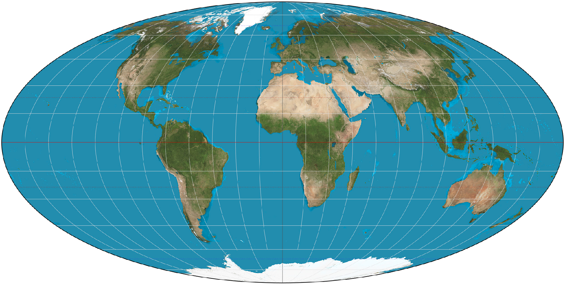Famously, the Mercator projection distorts the size of landmasses, making areas near the poles seem larger than areas near the equator. As a result, Europe and North America (not to mention Antarctica) take up more space on the Mercator map than they do on a globe, while Africa and South America are diminished. Contrary to the impression given by the image above, Africa is 23% larger than North America and fourteen times larger than Greenland. This perspective, which originated from and reinforced Euro-American colonial imperialist attitudes about the “global south” (actually more like the “global middle,” since most of the southern hemisphere is either ocean or Antarctica), has recently and rightfully been challenged. Simultaneously, the need for physical navigation charts has decreased. The result is the growing popularity of equal-area maps, such as the Mollweide projection, rather than equal-angle projections like the Mercator.