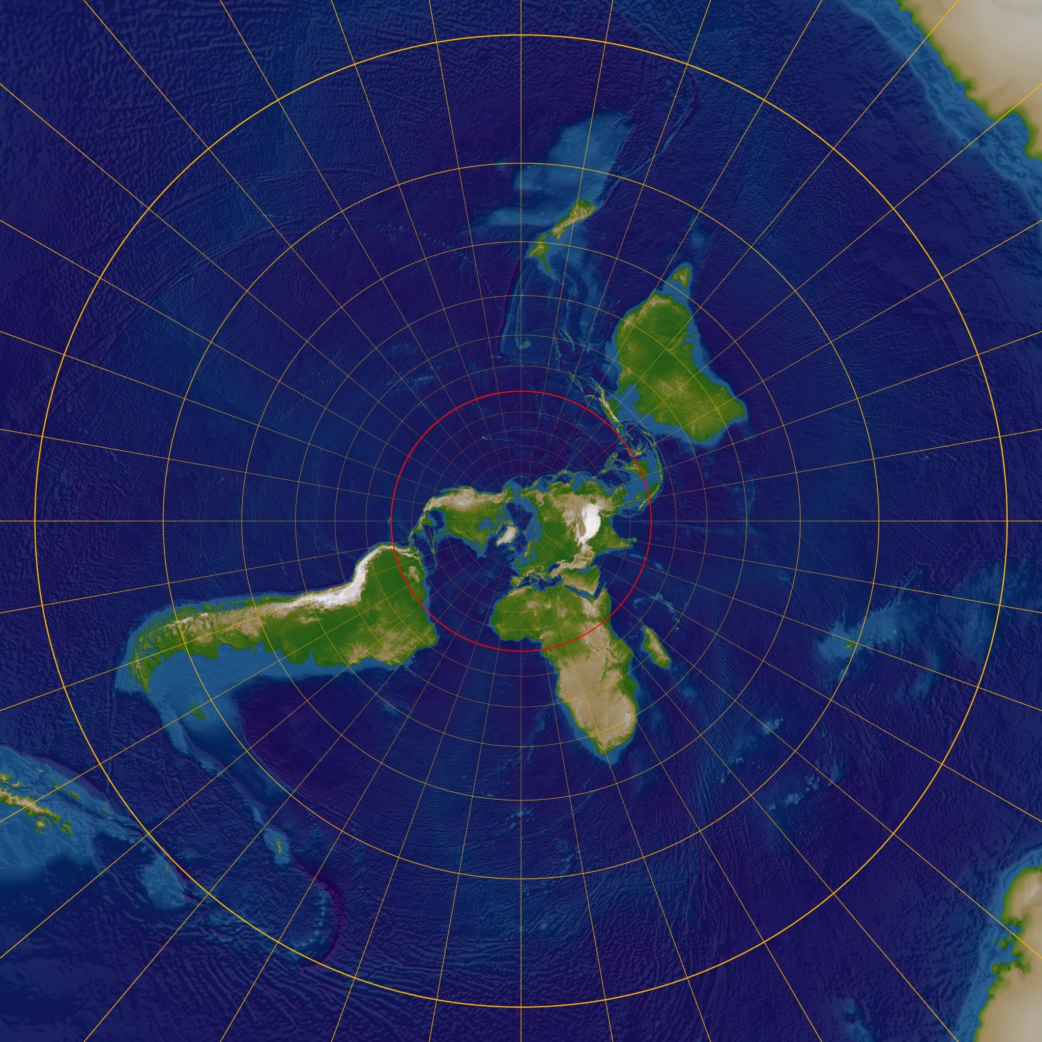 If we compare this set of circles to the stereographic map of the Earth I showed you earlier, you see that the inner and outer gold circles align exactly with the latitudes of the Tropic of Cancer and Tropic of Capricorn.