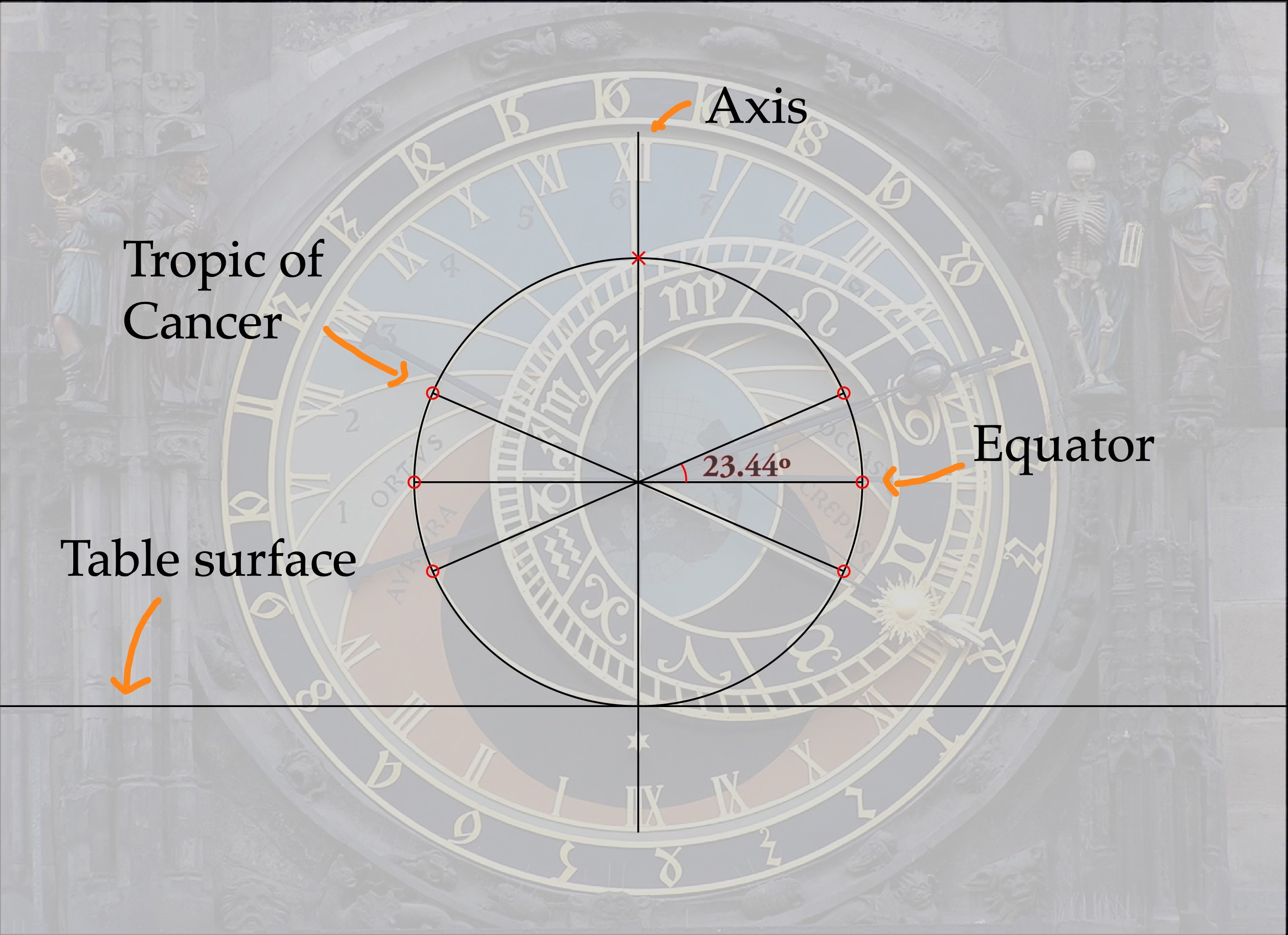 This is the start of a new series within my exploration of the Prague astronomical clock. In other series, I locate the clock in its historical context and I explain how the horizon on the Prague clock was drawn, compared to how it should have been drawn. In this series, we will work through the basic derivation of an astronomical clock to see how the main design of the clock face and the zodiac circle superimposed on it correspond to the shape of Earth and the Solar System.